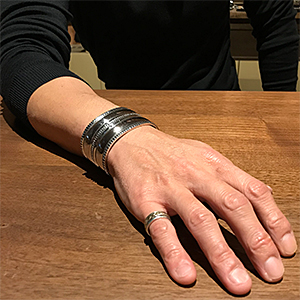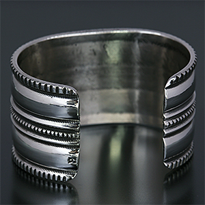 | Navajo/ナバホ族のアーティスト Harrison Jim/ハリソン・ジムに制作を依頼したバングルです。 地金はインゴットシルバーによるもので、チゼルワークによるナバホジュエリーを象徴するスタイルです。 飽きの来ないデザインはスタイルを選ばす、経年変化と共に味わい深い作品へと変化していきます。 | ||