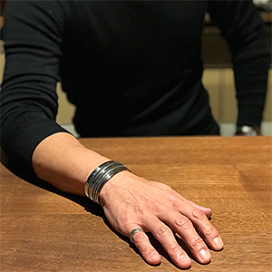 | Navajo/ナバホ族のアーティスト Harrison Jim/ハリソン・ジムに制作を依頼したバングルです。 地金はインゴットシルバーによるもので、チゼルワークによるナバホジュエリーを象徴するスタイルです。 奥深いスタンプのため表面はしっかりと凹凸が得られ、立体感が感じられます。 27mm幅の中にハリソンジムの世界観が表れた作品です。 | ||