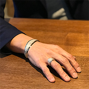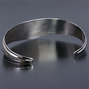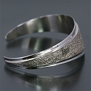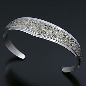 | Hopi/ホピ族のアーティスト Marlin Honhongva/マーリン・ホンホングヴァに制作依頼をしたバングルです。 シルバープレートに銀粉を焼き付けて独特の表情を演出しています。スタイリッシュなフォルムに荒々しい質感がバランスよく組み合わさっています。 素朴な風合いはトゥーファーとは異なった表情を楽しませてくれます。 | ||