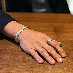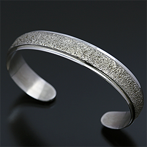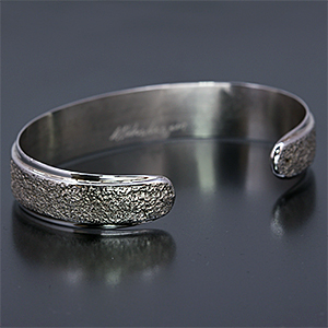 | Hopi/ホピ族のアーティスト Marlin Honhongva/マーリン・ホンホングヴァに制作依頼をしたバングルです。 シルバープレートに銀粉を焼き付けて独特の表情を演出しています。重ね着けにも使いやすいストレート仕様、スタイルを問わない作品です。 素朴な風合いはトゥーファーとは異なった表情を楽しませてくれます。 | ||