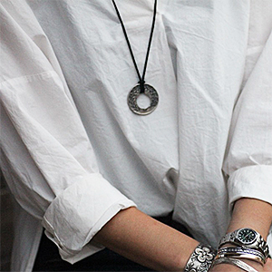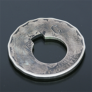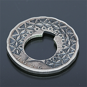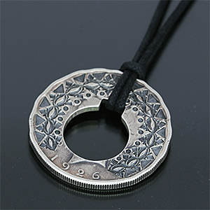 | NAVAJO/ナバホ族のアーティスト Sunshine Reeves/サンシャイン・リーブスに制作を依頼したペンダントです。 $1ピースダラー(1926年)を使用したNajaです。コインの形状を活かしつつ中心をくり抜きスタンプを加えて頂きました。 切り込み入れることでコットンレースとの一体感と動きを抑えた為、安定した着用感があります。 | ||