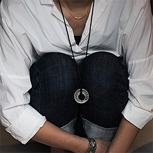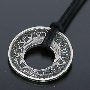 | NAVAJO/ナバホ族のアーティスト Sunshine Reeves/サンシャイン・リーブスに制作を依頼したペンダントです。 $1モーガンダラー(1921年)を使用したNajaです。コインの形状を活かしつつ中心をくり抜きスタンプを加えて頂きました。 切り込み入れることでコットンレースとの一体感と動きを抑えた為、安定した着用感があります。 | ||