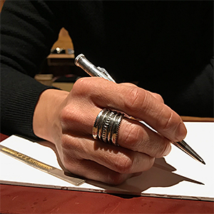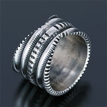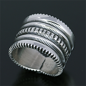 | Navajo/ナバホ族のアーティスト Harrison Jim/ハリソン・ジムに制作を依頼したリングです。 地金はインゴットシルバーによるもので、規則正しい深いチゼルワークとコインエッジに魅了されます。 最大幅約19mmの着け応えのある存在感、力強さを感じる大人の作品です。 | ||