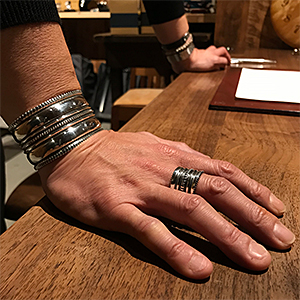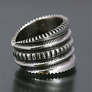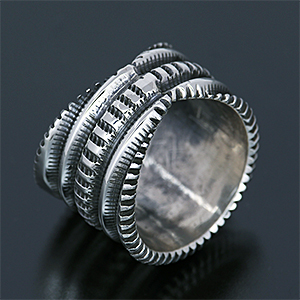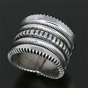 | Navajo/ナバホ族のアーティスト Harrison Jim/ハリソン・ジムに制作を依頼したリングです。 地金はインゴットシルバーによるもので、規則正しい深いチゼルワークとコインエッジに魅了されます。 最大幅約19mmの着け応えのある存在感、力強さを感じる大人の作品です。 | ||