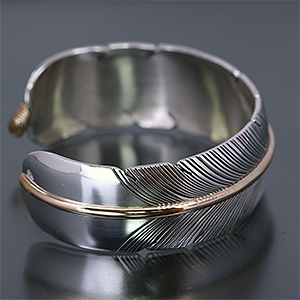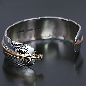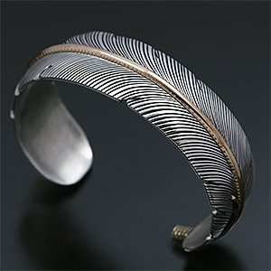 | NAVAJO/ナバホ族のアーティスト Harvey Mace/ハーヴィー・メイスに制作を依頼したバングルです。 躍動感のあるフェザーモチーフの作品です。 センターラインは12KGF(12金張り)が使用されているため、上品で落ち着いた雰囲気があります。また、シルバーとのカラーバランスが絶妙です。 美しい曲線と共にフェザーがしっかりとデザインされていますので、どなたでもお楽しみ頂ける作品です。 | ||