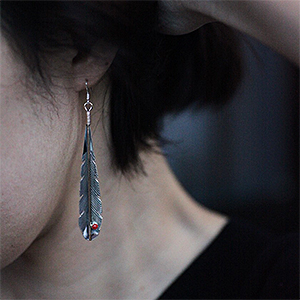 | Navajo/ナバホ族のアーティスト Tanya Mace/ターニャ・メイスに制作を依頼したピアス>です。 躍動感のあるフェザー、センターラインは12KGF(12金張り)が使用されているため、上品で落ち着いた雰囲気があります。 存在感のあるサイズ感とコーラルが良いアクセントになっています。 | ||