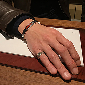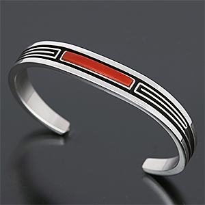 | NAVAJO/ナバホ族のアーティスト Albert Nells/アルバート・ネルスに制作を依頼したバングルです。 テーパー付きのスタイリッシュなフォルムに、インレイが施された代表的作品の一つです。 銀と黒のコントラストがしっかり効いており、差し色にもなるコーラルを使用して頂きました。 シンプルで綺麗なスタイルによく映えるバングルです。 | ||