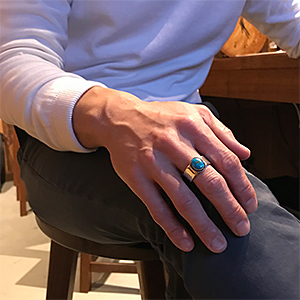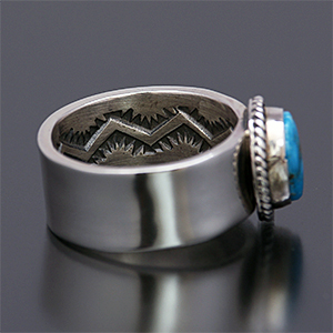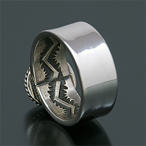 | NAVAJO/ナバホ族のアーティスト Sunshine Reeves/サンシャイン・リーブスに制作を依頼したリングです。 表面はプレーン、内側にスタンプを施して頂きました。石はブルージェム、美しい鏡面仕上げとの相性は抜群です。 主張しすぎないシンプルさがスタイルの幅を広げてくれます。 | ||
