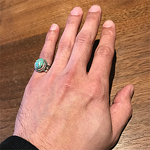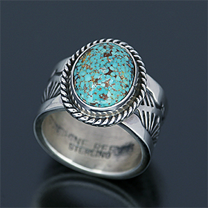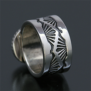 | NAVAJO/ナバホ族のアーティスト Sunshine Reeves/サンシャイン・リーブスに制作を依頼したリングです。 表面にスタンプを施して頂いた作品です。石はターコイズマウンテン、ナバホジュエリーを代表するようなオーソドックスなスタイルでの提案です。 武骨さと清々しさを兼ね備え、スタイルを問わない着けやすさが持ち味です。 | ||