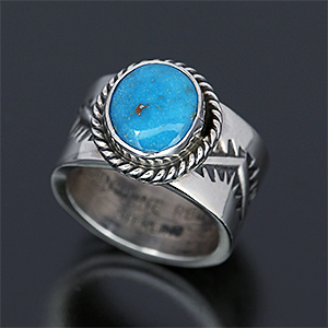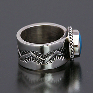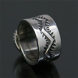 | NAVAJO/ナバホ族のアーティスト Sunshine Reeves/サンシャイン・リーブスに制作を依頼したリングです。 表面にスタンプを施して頂いた作品です。石はモレンシ、ナバホジュエリーを代表するようなオーソドックスなスタイルでの提案です。 武骨さと清々しさを兼ね備え、スタイルを問わない着けやすさが持ち味です。 | ||