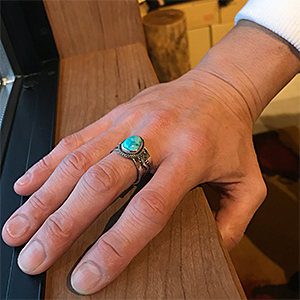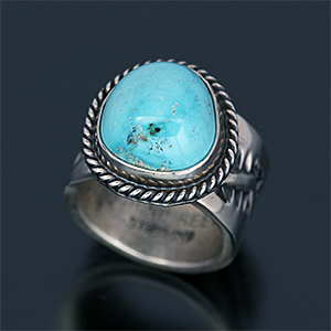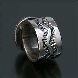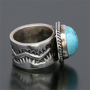| NAVAJO/ナバホ族のアーティスト Sunshine Reeves/サンシャイン・リーブスに制作を依頼したリングです。 表面にスタンプを施して頂いた作品です。石はキングマン、ナバホジュエリーを代表するようなオーソドックスなスタイルでの提案です。 武骨さと清々しさを兼ね備え、スタイルを問わない着けやすさが持ち味です。 | ||