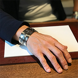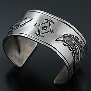 | NAVAJO/ナバホ族のアーティスト Jacob D. Morgan/ジェイコブ・モーガンに制作を依頼したバングルです。 12GのシルバープレートにリポウズによるBi-Curveデザイン、センターにはナバホラグにも使用されるダイヤデザインが印象的で、味わい深い作品に仕上がっています。 ジェイコブ・モーガンが手掛けるナバホジュエリー、どうぞお楽しみください。 | ||