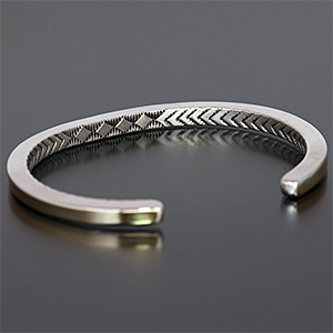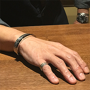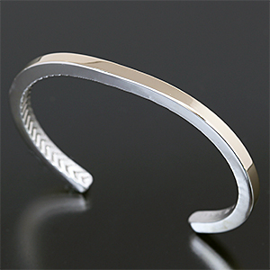 | NAVAJO/ナバホ族のアーティスト Bruce Morgan/ブルース・モーガンに制作を依頼したバングルです。 RIVER MAILの別注による#6スクエアワイヤーを使用した作品です。 厚み幅ともに約4mmのシルバーワイヤーを使用しており、トップ部分に14Kをオーバーレイしています。 表側は簡素な美が追及されたプレーンスタイル、裏側に4ダイヤ+アローのデザインを施して頂いています。 単体でお使い頂くのも良いですが、他のバングルと重ね着けにも重宝する作品です。 | ||