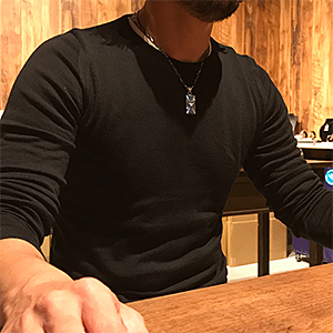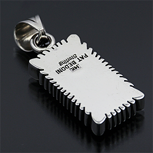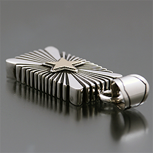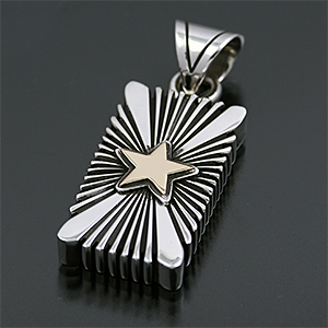 | Navajo/ナバホの女性アーティスト Patricia Bedonie/パトリシア・べドニーに制作依頼をしたペンダントです。 正確で美しいチゼルワークによるスターバーストデザインです。スター型のパーツは14Kとシルバーのダブルスターで仕上げて頂いています。 #1フラットワイヤー(約5mm厚)を使用していますが、厚みがあるため側面のエッジがより際立っているのがよく分かります。 コンパクトなサイズながらもしっかりと主張している作品です。 | ||