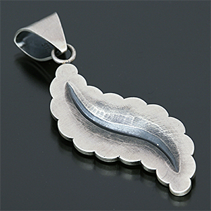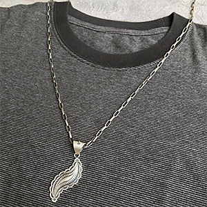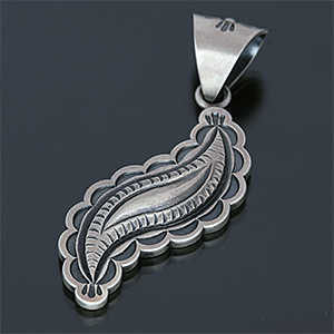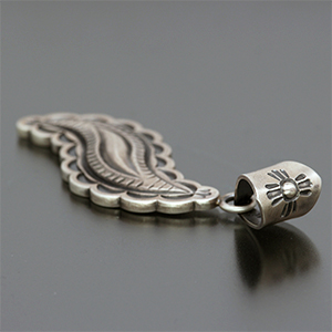 | Navajo/ナバホ族のアーティスト Jacob D. Morgan/ジェイコブ・モーガンに制作を依頼したペンダントです。 緩いカーブしたデザインに沿ってリポウズされた作品、こちらはジェイコブがBi-Curve(弯曲名)と呼ぶスタイルです。 メキシコから伝わったデザインの一つですが、主にウエスタンブーツ・シャツなどのウエスタンアイテムに使われていたデザインをジュエリーに落とし込んだものです。 ジェイコブが表現する伝統的なデザインをお楽しみください。 | ||