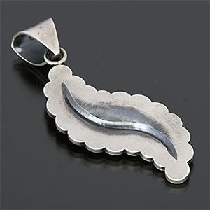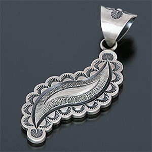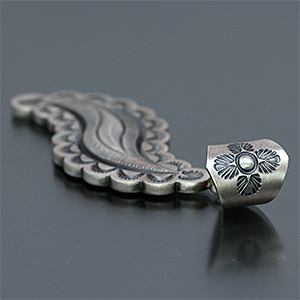 | Navajo/ナバホ族のアーティスト Jacob D. Morgan/ジェイコブ・モーガンに制作を依頼したペンダントです。 緩いカーブしたデザインに沿ってリポウズされた作品、こちらはジェイコブがBi-Curve(弯曲名)と呼ぶスタイルです。 メキシコから伝わったデザインの一つですが、主にウエスタンブーツ・シャツなどのウエスタンアイテムに使われていたデザインをジュエリーに落とし込んだものです。 ジェイコブが表現する伝統的なデザインをお楽しみください。 | ||