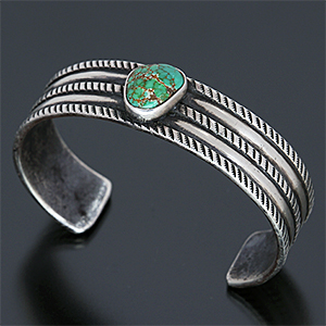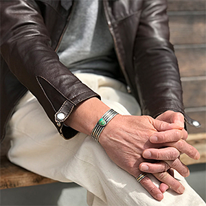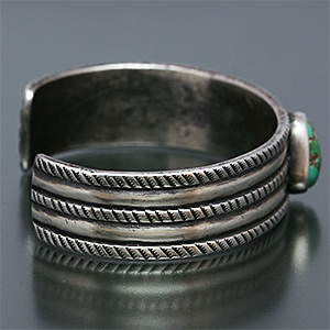 | Creek/クリーク族のアーティスト Jesse Robbins/ジェシー・ロビンズが制作したバングルです。 地金はコインを溶かして制作されており、ヴィンテージのような味わい深い作品に仕上がっています。 チゼルワークによるシンプルなスタイルは飽きが来ず長くご愛用して頂けるため、経年変化とともにより愛着が湧きます。 石はジェシー所有のキャリコレイクをセットしています。 ジェシー・ロビンズが手掛けるジュエリー、どうぞお楽しみください。 | ||