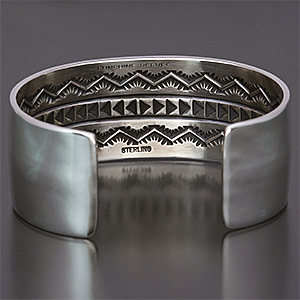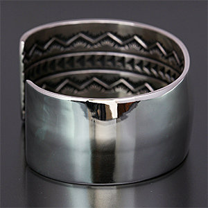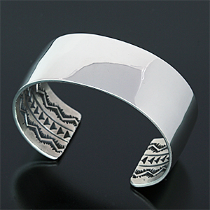 | Navajo/ナバホ族のアーティスト Sunshine Reeves/サンシャイン・リーブスに制作を依頼したバングルです。 表はプレーン、裏にスタンプを施して頂いた作品です。 シンプルな美をテーマに鏡面仕上げの美しい光沢は存在感を発揮します。長年使用して頂くことで経年変化を感じて頂ける作品です。 | ||