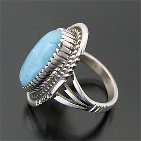 | NAVAJO/ナバホ族のアーティストがラリマーを使用して制作したリングです。 ラリマーは近年、非常に人気のあるストーンで、採掘されている場所はハイチとの国境そば、カリブ海を見下ろす中米ドミニカ共和国のBaorucoという村近くの山深い場所1箇所のみなので、その希少性が人気の要因の1つと言えます。 穏やかで透き通ったブルーがとても印象的で、ターコイズとは異なった柔らかく、優しい雰囲気を漂わせてくれるストーンです♪ ラリマーを大胆に使用した、ナバホ族らしいワイルドな作品ですが、ラリマーを使用することで、清潔感のある作品に仕上がっております! | ||