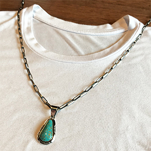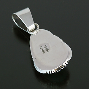 | NAVAJO/ナバホ族のアーティスト Lonnie Willie/ロニー・ウィリーが制作したペンダントです。 石の周りにはシャドーボックス(石の周りの溝部分)が用いられており、この技法によって奥行きがでるのでより立体的な仕上がりとなっています。 サンプル画像のチェーンはホピチェーン中を組合わせています。 | ||
