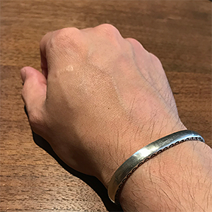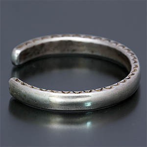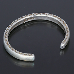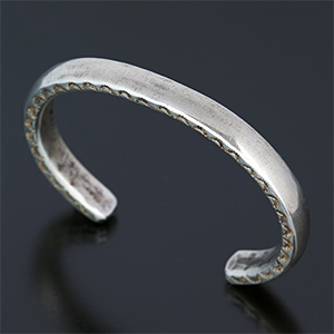| Creek/クリーク族のアーティスト Jesse Robbins/ジェシー・ロビンズに制作依頼をしたバングルです。 コインシルバーから成形された地金、側面にスタンプが施されているシンプルな作品です。素材の良さとジェシーが手掛けるオールドスタイルが上手く組み合わさっています。 ジェシー・ロビンズが手掛けるジュエリー、どうぞお楽しみください。 | ||