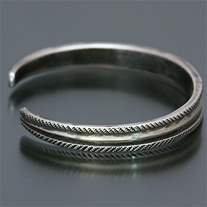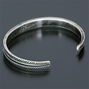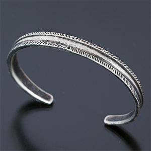 | Creek/クリーク族のアーティスト Jesse Robbins/ジェシー・ロビンズに制作依頼をしたバングルです。 コインシルバーから成形された地金はターミナルに向けて細くなっていく形状です。 チゼルワークとやすりがけで表現されたデザイン、素材の良さとジェシーが手掛けるオールドスタイルが上手く組み合わさっています。 ジェシー・ロビンズが手掛けるジュエリー、どうぞお楽しみください。 | ||