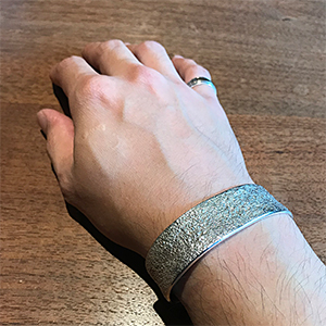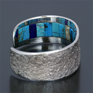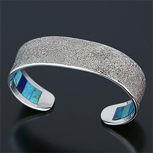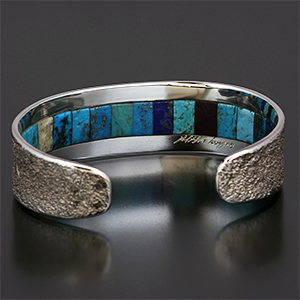 | Hopi/ホピ族のアーティスト Marlin Honhongva/マーリン・ホンホングヴァに制作依頼をしたバングルです。 インサイドインレイによる伝統的スタイルでのオーダーです。曲線に合わせてカットした石をはめ込む技術は代々受け継がれる確かな技術力だと思います。 シルバープレートの上に銀粉を焼き付けて独特の表情を演出しています。トゥーファ―とは異なる荒々しい質感との対照がバランス良く、シンプルで落ち着いた味わい深さがあります。 | ||