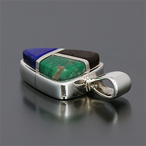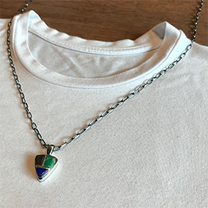 | Hopi/ホピ族のアーティスト Marlin Honhongva/マーリン・ホンホングヴァに制作依頼をしたペンダントです。 現代的なスタイルですが、マーリンにとっては親族から受け継がれる伝統的スタイルです。 一つ一つ丁寧にセットされたそれぞれのストーン、素材の良さとカラーセンスが感じられます。 上品で風格のある作品をお楽しみください。 | ||