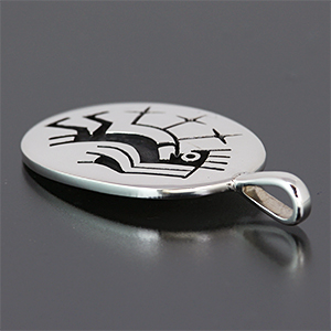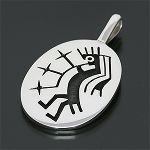 | HOPI/ホピ族のアーティスト Ricky Coochwytewa/リッキー・クーチュワイテワに制作を依頼をしたペンダントです。 オーバーレイ技法を用いて父親のヴィクターから受け継がれたスターブロワーズ(天国で星を生み出す精霊)がデザインされています。 彼らの世界観が表現された作品をお楽しみください。 | ||