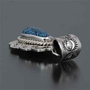 | NAVAJO/ナバホ族のアーティスト Kevin Ramone/ケビン・ラモーンが制作したペンダントです。 スタイルをしやすいサイズ感にウエブが印象的なキングマンをセットしています。 ナバホジュエリーらしい伝統的なスタンプとの相性も良く、小ぶりながらも石の表情がしっかりとしているため存在感を感じます。 ※着用イメージに使用しているチェーン | ||