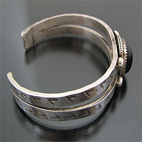 | TAOS/タオス プエブロの有名アーティスト Sonny Spruce/ソニー・スプルースが制作したバングルです。 オニキスが使用された味わい深いバングルで、シルバーの土台にはスタンプワークが施されています! ベーシックなデザインですが、美しいデザインは、スタイルを選ばず、どんな場面でも活躍してくれます。 ソニー氏の住居と店はアドビーハウスで、ジュエリーの他にダンスの名手としても有名です。 ※サイズは多少変更が出来ますのでお気軽にお問い合わせくださいませ。 | ||