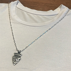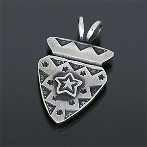 | NAVAJO/ナバホ族のアーティスト Bo Gary Reeves/ボー・ゲーリー・リーブスに制作を依頼したペンダントです。 アローヘッドデザインにスタンプワークが施されており、スターがアップリケされています。 控え目な光沢が印象的で、風合いと雰囲気のある作品に仕上がっています。またスタイルしやすいサイズ感も魅力的です。 ※着用イメージに使用しているチェーン | ||
