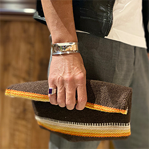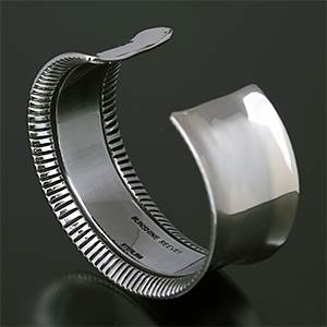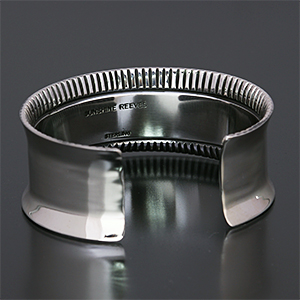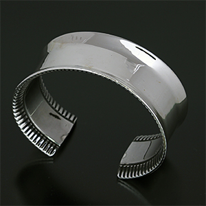 | Navajo/ナバホ族のアーティスト Sunshine Reeves/サンシャイン・リーブスに制作を依頼したバングルです。 表はプレーン、裏にチゼルを施して頂いた作品で、縁はアールをつけて頂きましたので肌あたりの良い柔らかい着け心地を感じて頂けます。 シンプルな美をテーマに鏡面仕上げの美しい光沢は存在感を発揮します。長年使用して頂くことで経年変化を感じて頂ける作品です。 | ||