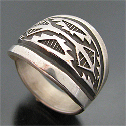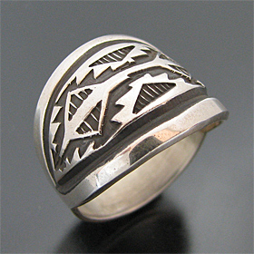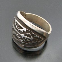 | NAVAJO/ナバホ族の人気アーティスト Troy Laner/トロイ・ラナーが制作したリングです。 スタンプワーク技法を用いて、ナバホラグのデザインが施されています。 日本でもお馴染みのアーティストで幅広いファッションに合わせやすく、シンプルなので他のリングともコーディネイトしやすいアイテムです。 | ||