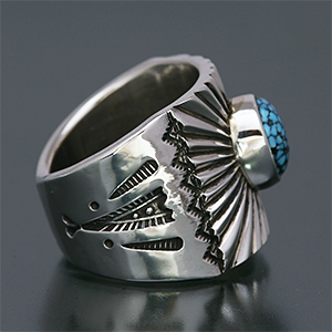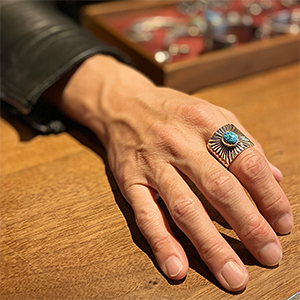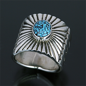 | NAVAJO/ナバホ族のアーティスト Clendon Pete/クレンドン・ピートに制作を依頼したリングです。 しっかりと立ち上がったサンバーストにRIVER MAIL所有のキングマンを渡してセットして頂きました。ナバホジュエリーを代表するようなデザインの一つですが、制作する作家によって表現方法が異なるのもインディアンジュエリーの面白みです。 クレンドンの世界観をお楽しみください。 | ||