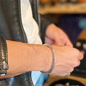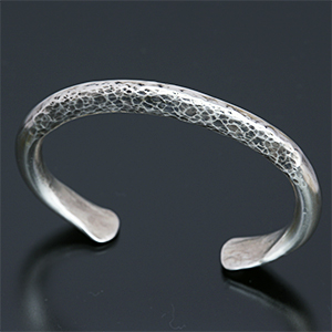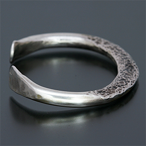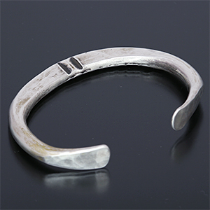| Blackfoot/ブラックフット族のJames Faks/ジェームス・フォックスに制作を依頼しバングルです。 前回よりヘビーさが増したラウンドワイヤーを使用し、トップとターミナルをハンマーで叩くことによって平面に仕上げ独特の形状が生まれています。デザインは意図的に叩かれたハンマーの跡に、もう片面は2本のラインが印象的で様々な表情見せます。 高さは約10mm近くあり、重ね着けにも重宝する一本になります。一本の丸いワイヤーから仕上げれられた遊び心が詰まっている作品をお楽しみください。 | ||