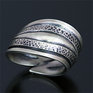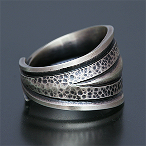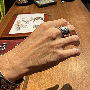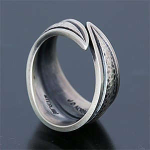 | Navajo/ナバホ族のアーティスト Jacob D. Morgan/ジェイコブ・モーガンに制作を依頼したリングです。 緩いカーブしたデザインに沿ってリポウズされた作品、こちらはジェイコブがBi-Curve(弯曲名)と呼ぶスタイルです。 メキシコから伝わったデザインの一つですが、主にウエスタンブーツ・シャツなどのウエスタンアイテムに使われていたデザインをジュエリーに落とし込んだものです。 ジェイコブが表現する伝統的なデザインをお楽しみください。 | ||