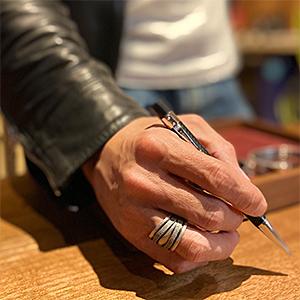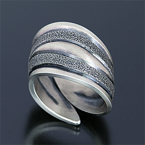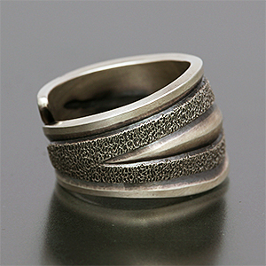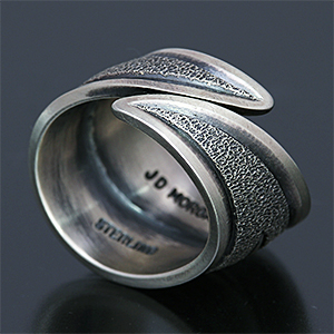 | Navajo/ナバホ族のアーティスト Jacob D. Morgan/ジェイコブ・モーガンに制作を依頼したリングです。 緩いカーブしたデザインに沿ってリポウズされた作品、こちらはジェイコブがBi-Curve(弯曲名)と呼ぶスタイルです。 メキシコから伝わったデザインの一つですが、主にウエスタンブーツ・シャツなどのウエスタンアイテムに使われていたデザインをジュエリーに落とし込んだものです。 ジェイコブが表現する伝統的なデザインをお楽しみください。 | ||