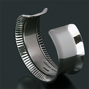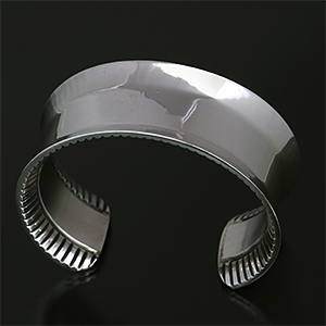 | Navajo/ナバホ族のアーティスト Sunshine Reeves/サンシャイン・リーブスに制作を依頼したバングルです。 表はプレーン、裏にチゼルを施して頂いた作品で、縁はアールをつけて頂きましたので肌あたりの良い柔らかい着け心地を感じて頂けます。 シンプルな美をテーマに鏡面仕上げの美しい光沢は存在感を発揮します。長年使用して頂くことで経年変化を感じて頂ける作品です。 | ||