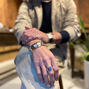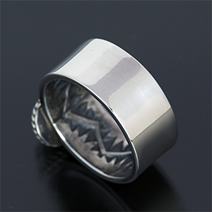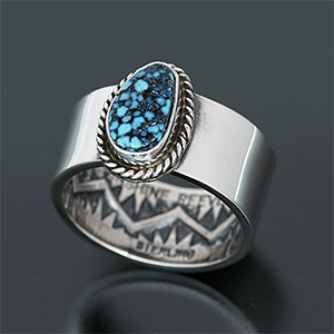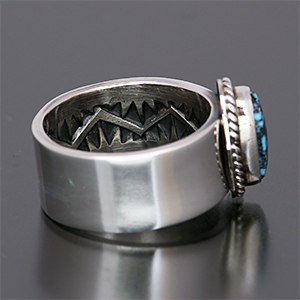 | NAVAJO/ナバホ族のアーティスト Sunshine Reeves/サンシャイン・リーブスに制作を依頼したリングです。 表面はプレーン、内側にスタンプを施して頂きました。石はキングマン、美しい鏡面仕上げとの相性は抜群です。 主張しすぎないシンプルさがスタイルの幅を広げてくれます。 | ||