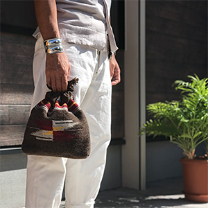 | アメリカはニューメキシコ州チマヨで昔ながらの製法で手織りされているTrujillo's/トゥルフィリオス社のドローストリングバッグです。 昔ながらの製法で手織りされたブランケット生地は重厚でしっかりと目が詰まり、手作業により生まれるムラが経年変化と共に柔らかさを生み出していきます。 財布、スマートフォンなどの小物を収納する丁度良いサイズ感です。バッグインバッグとしてもお勧めです。 | ||