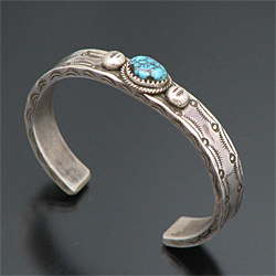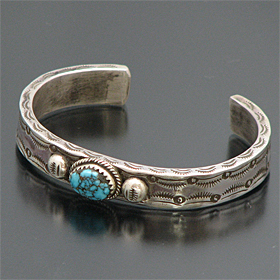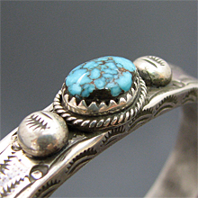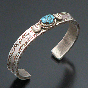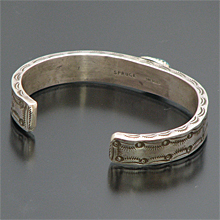 | TAOS/タオス プエブロの有名アーティスト Sonny Spruce/ソニー・スプルースが制作したバングルです。 幅は細めですが、圧倒的な重量感のあるヘビーゲージシルバーにスタンプワーク、何といってもナンバーエイトターコイズのオーラに圧倒され、見た目以上に存在感があります! オーソドックスなデザインですが、美しいデザインは、スタイルを選ばず、どんな場面でも活躍してくれます。 ソニー氏の住居と店はアドビーハウスで、ジュエリーの他にダンスの名手としても有名です。 ※サイズは多少変更が出来ますのでお気軽にお問い合わせくださいませ。 | ||