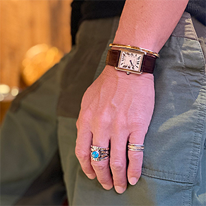 | Navajo/ナバホ族のアーティスト Leonard Nez/レオナルド・ネズに制作を依頼したリングです。 弓矢をいるときに着けるボーガードに使用されるナバホの伝統的デザイン"ケトー"でのオーダーです。石はターコイズマウンテンをセットして頂き、コントラストが効いている作品に仕上がっています。 洋服のアクセントにもなる上品な色味と落ち着いた雰囲気からは大人の品格が感じ取れます。 | ||