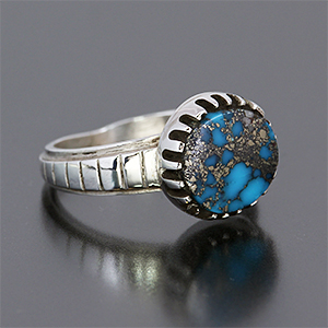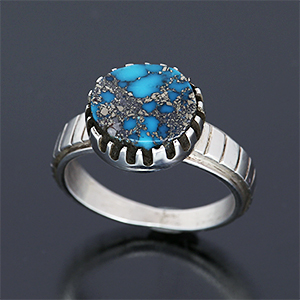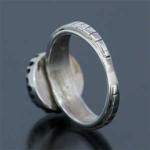 | Hopi/ホピ族のアーティスト Marlin Honhongva/マーリン・ホンホングヴァに制作依頼をしたリングです。 細身の幅にテーパー付き、上質のイサカピークをセットした作品です。落ち着いたデザインにシンプルに石が象徴されており、着用すると品格を感じます。 単体でワンポイントで見せる大人の着け方の他、スタイルを広げることが出来るアイテムです。お持ちの作品とバランスを考えながらお楽しみください。 | ||
