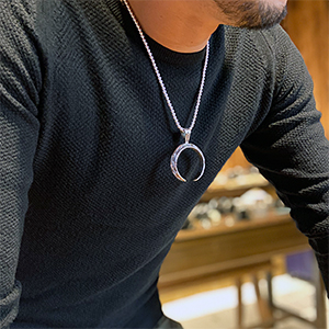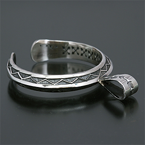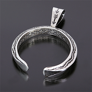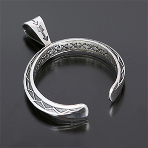 | NAVAJO/ナバホ族のアーティスト Sunshine Reeves/サンシャイン・リーブスに制作を依頼したペンダントです。 伝統的モチーフでもある”ナジャ”をトライアングルワイヤーで表現した作品です。3面スタンプはどの角度から見てもサンシャインらしさを感じ取って頂ける思います。 着用画像のようにボールチェーンで合わすのもいいですし、コットンレースの紐などでカジュアルな雰囲気を演出してお楽しみください。 | ||