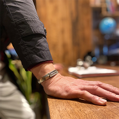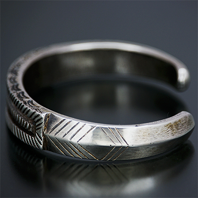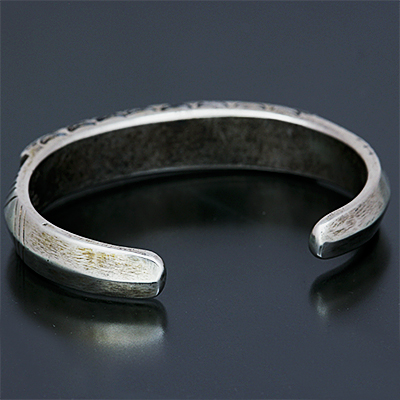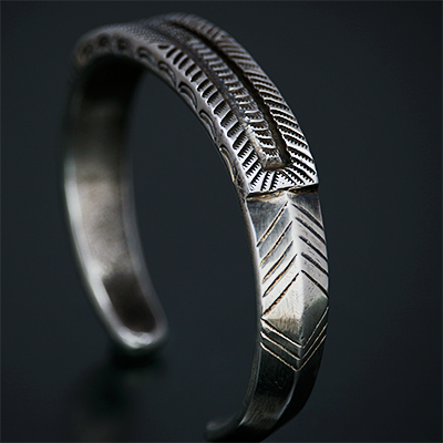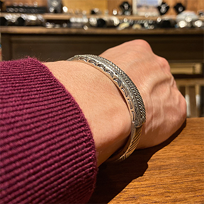 | Creek/クリーク族のアーティスト Jesse Robbins/ジェシー・ロビンズに制作依頼をしたバングルです。 コインシルバーから成形された地金、多くのカスタマーに愛されるクラシックスタイル、細身ながらも厚みのあるしっかりとした重量感があります。 着けやすい幅にもにも拘らずしっかりとした主張感があり、重ね着けにも重宝するためスタイルの幅が広がる作品です。 厚みのある地金にしっかり打ち込まれたスタンプは大胆であり、古き良きスタイルを大切にしているジェシー・ロビンズならではの世界観が表れています。 | ||