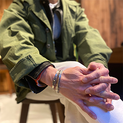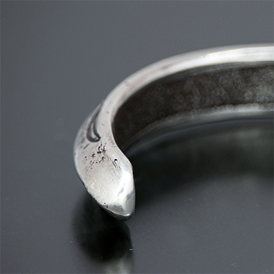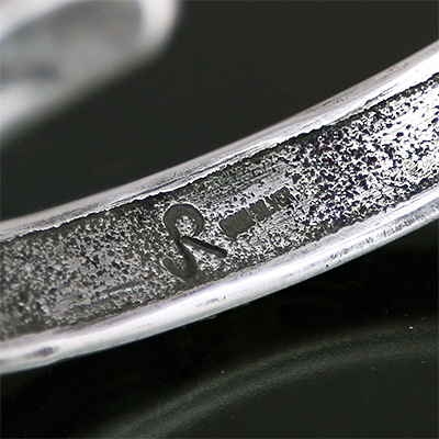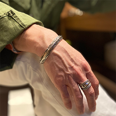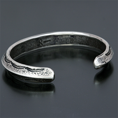 | Creek/クリーク族のアーティスト Jesse Robbins/ジェシー・ロビンズに制作依頼をしたバングルです。 コインシルバーから成形された地金、多くのカスタマーに愛されるクラシックスタイル、トライアングルの形状になっているため高さがあり、重ね着けにも活躍するアイテムでもあります。 また内側は丁寧にアールをつけているためソフトな着け心地を堪能して頂けます。 厚みのある地金にしっかり打ち込まれたスタンプは大胆であり、古き良きスタイルを大切にしているジェシー・ロビンズならではの世界観が表れています。 | ||