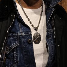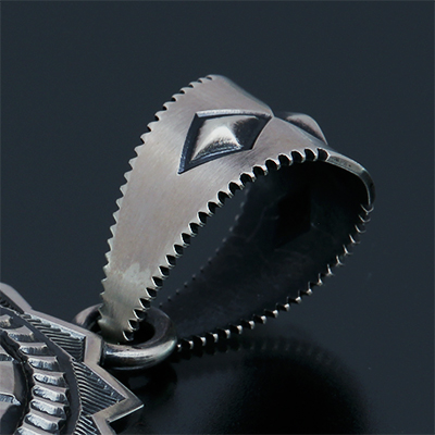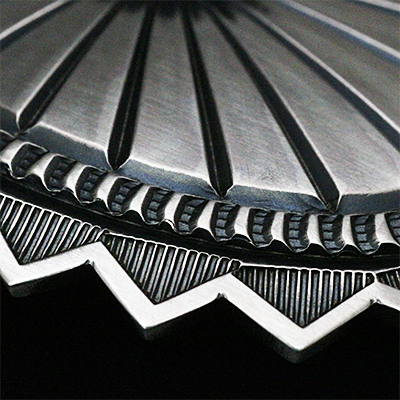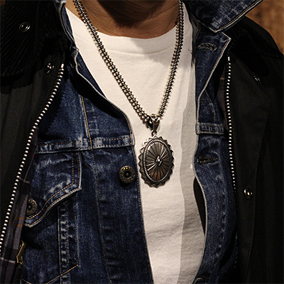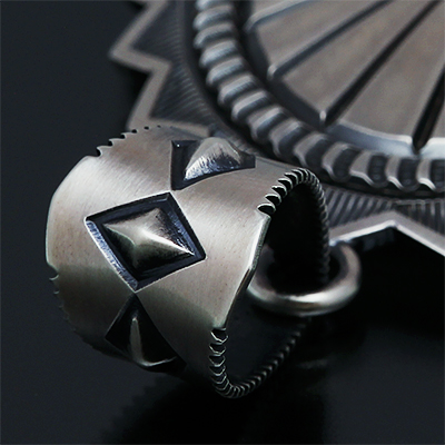 | Navajo/ナバホ族のアーティスト Jacob D. Morgan/ジェイコブ・モーガンに制作を依頼したペンダントです。 14ga(約1.6mm)のシルバープレートにサンバーストをデザインした作品、ナバホのコンチョバックルに使用されるものをイメージしてペンダントとして制作して頂いた伝統的スタイルのアイテムです。 一つ一つ丁寧に打たれたスタンプと細部の処理の仕方まで手が抜かれていないのが画像からよくわかります。 バチカンのバンプアウトにサイドのギザギザの見せ方、作品への情熱が伝わってきます。 ビーズチェーンとの相性は抜群です。ご希望の方はお気軽にお問合せください。 | ||