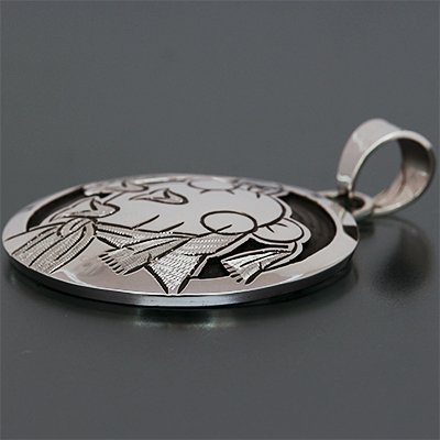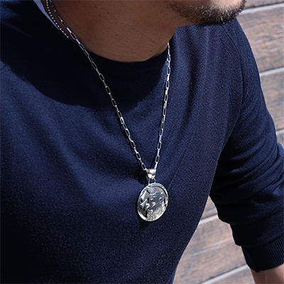 | Hopi/ホピ族のアーティスト Emmett Navakuku/エメット・ナバククに制作依頼をしたペンダントです。 マッドヘッドで制作して頂いた作品です。滑らかな曲線にカットされたマッドヘッドはオーバーレイによるもので、所々にテクスチャーを加えている為作品に締まりがあります。 裏側にはスタンプによるレインクラウドが施されており、エメットのスタイルがしっかりと盛り込まれています。 また緩いカーブ付きとなりますので立体感も得られています。 チェーンホールもしっかり確保していますので、当店の取り扱いのボールチェーン、またはホピチェーンが相性良くスタイルして頂けます。 | ||