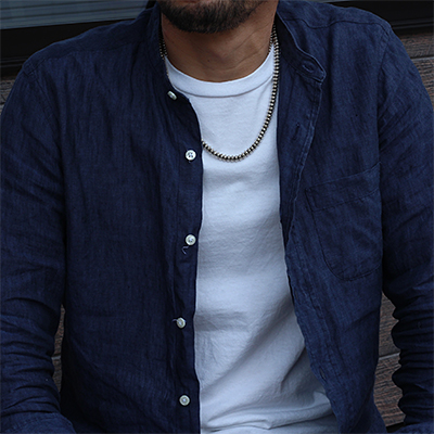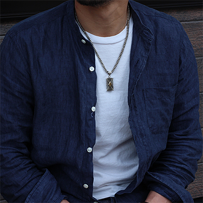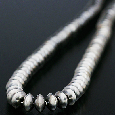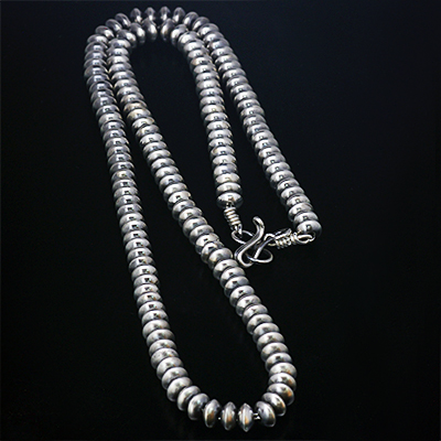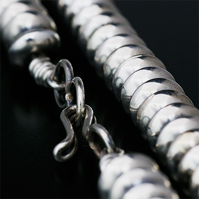 | Navajo/ナバホ族のJan Mariano/ジャン・マリアーノによるビーズチェーンです。 一つ一つ手作りでビーズを制作し、それを繋ぎ合わせた手間の掛かる作品です。 鈍い光沢が落ち着いた雰囲気を出し、小さ目のサイズになりますので幅広くスタイルをお楽しみ頂けます。 単体で合わされるのにもご活用頂けるアイテムですので、バランスを考えながらライフスタイルに取り入れてください。 | ||